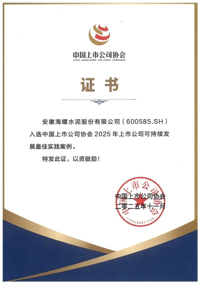 2025年11月18日,中國上市公司協(xié)會在北京召開了第三屆理事會第六次會議和2025上市公司可持續(xù)發(fā)展大會,大會舉行了“2025董事會最佳實(shí)踐案例”“2025可持續(xù)發(fā)展最佳實(shí)踐案例”發(fā)布儀式,海螺水泥同時(shí)榮獲“2025董事會最佳實(shí)踐案例”和“2025上市公司可持續(xù)發(fā)展最佳實(shí)踐案例”。